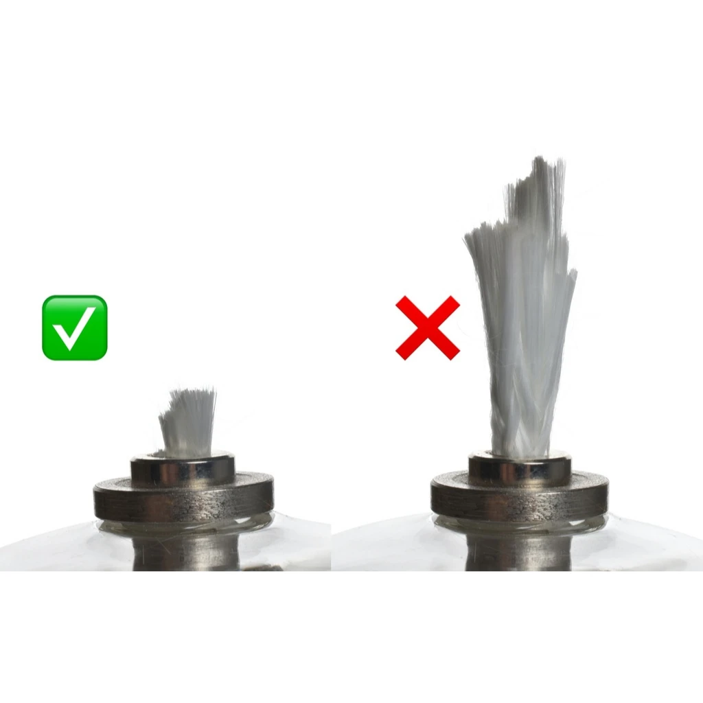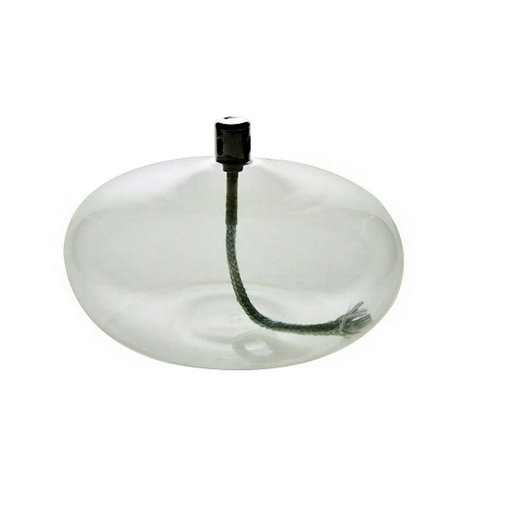 Lampe en verre transparent, tube en métal et mèche en fibre de verre